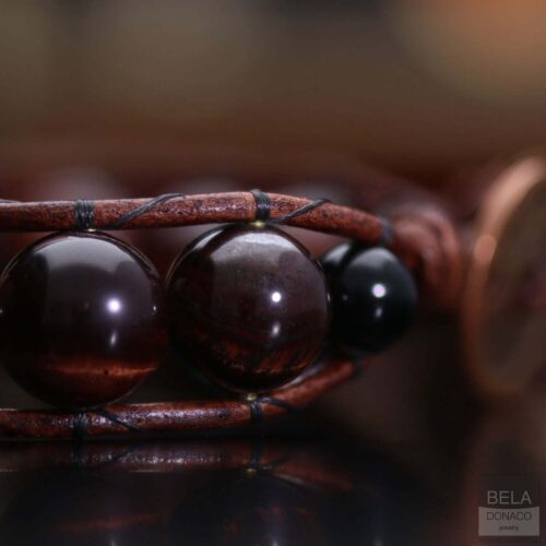 - Stijlvolle herenarmband van vintage bruin leer gecombineerd met 8 mm mat zwarte onyx kralen en een Sterling Zilveren Bela Donaco sluiting. Dubbele wikkel, op maat gemaakt voor perfecte pasvorm.