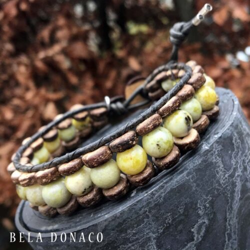 - Handgemaakte armband met gele Opaal, Jade, Tsjechisch glas en natuurlijk leder. De 6 mm Opaal en Jade kralen geven een verfijnde uitstraling. De armband sluit met een kokosknoop en wordt op maat gemaakt. Afgewerkt met Sterling Zilver voor een vleugje luxe.