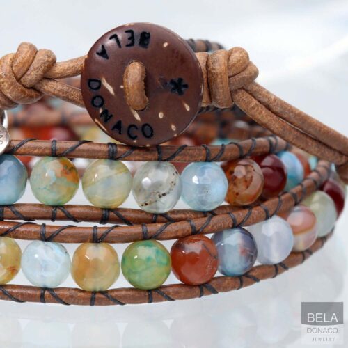 - Classic drie wikkelarmband van natuurlijk buffelleer, afgewerkt met 6 mm facetgeslepen Indiase Agaat kralen en een Sterling Zilveren Bela Donaco knoop. Wordt op maat gemaakt voor een perfecte pasvorm.