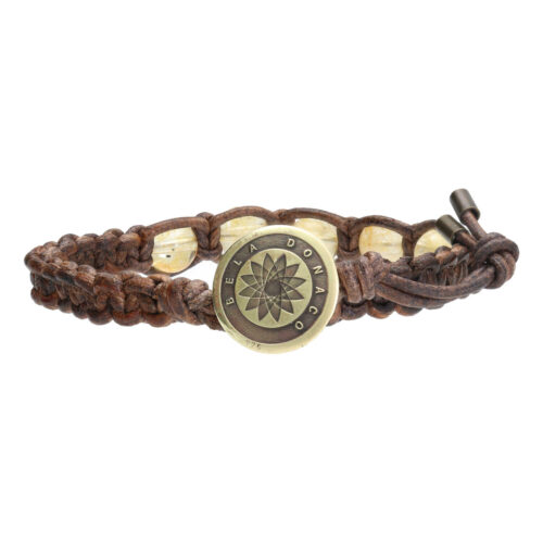 - Prachtige armband vervaardigd uit Zonnesteen, facet geslepen Fossil, Tsjechisch glas en vintage leer. Met kralen van 6 mm en een kokosknoopsluiting, biedt deze armband verfijning en maatwerk. Afgewerkt met Sterling Zilver voor een luxe touch.