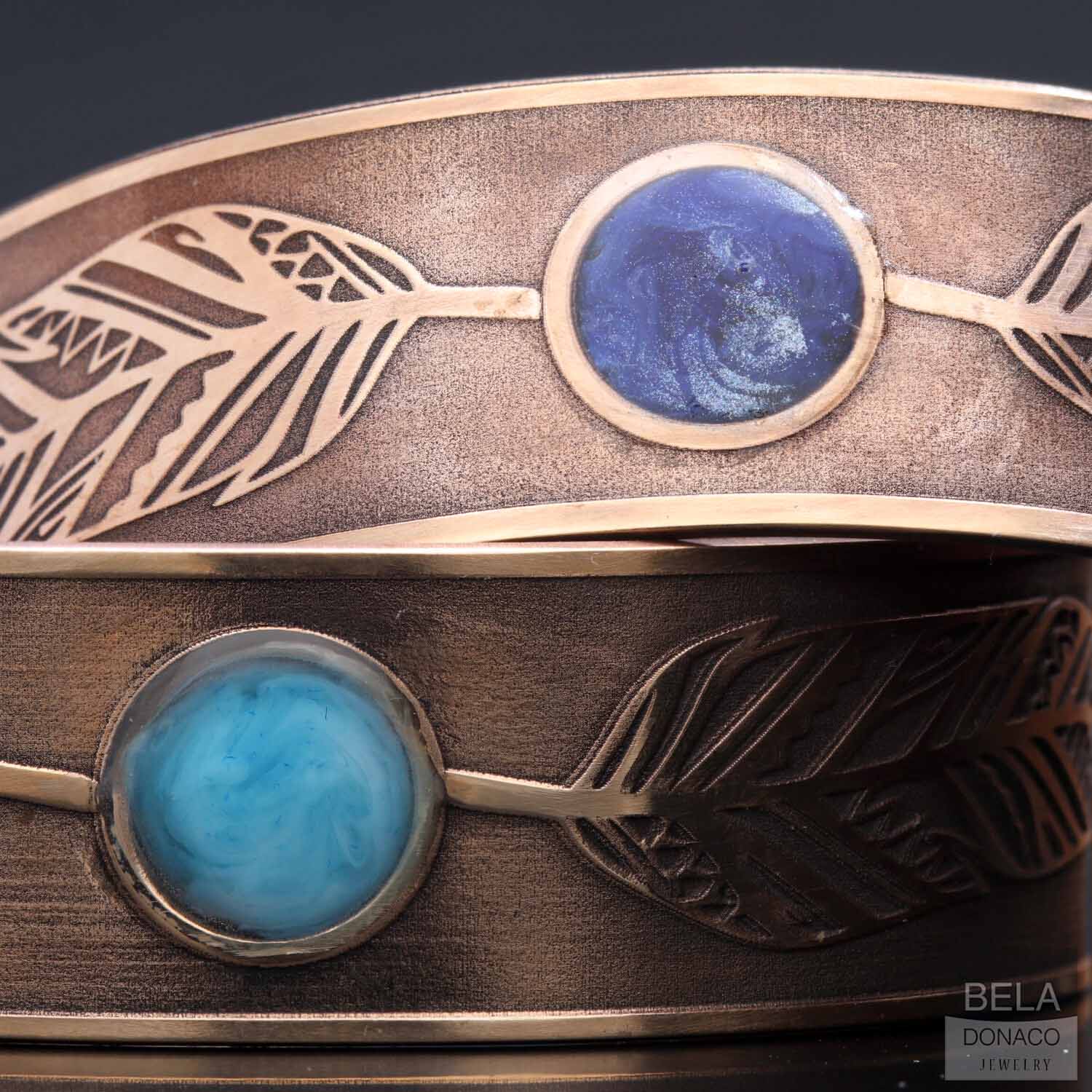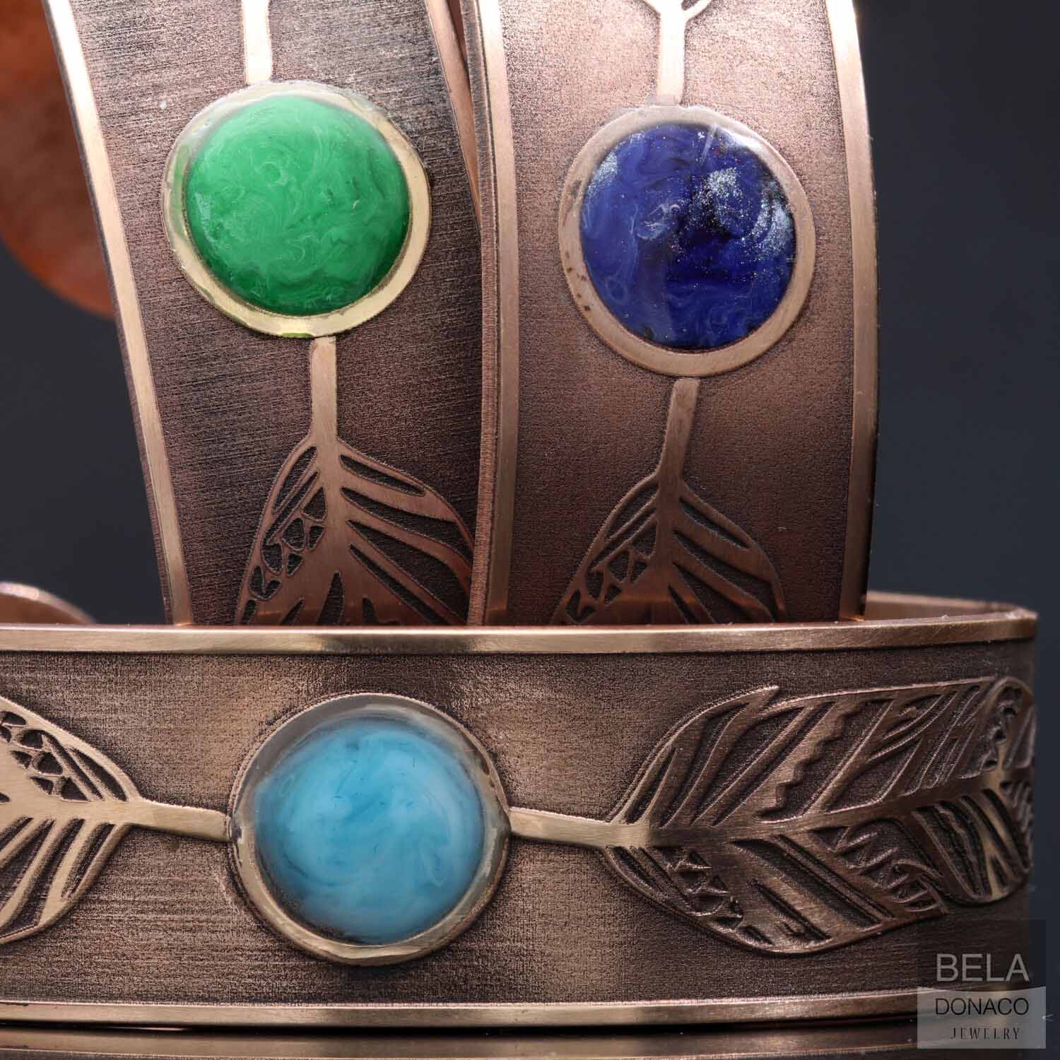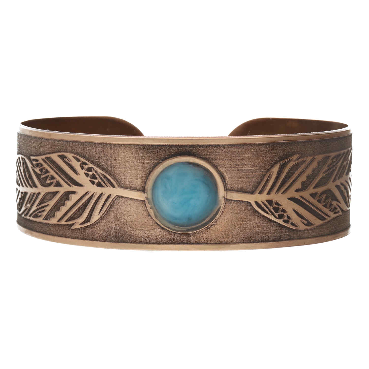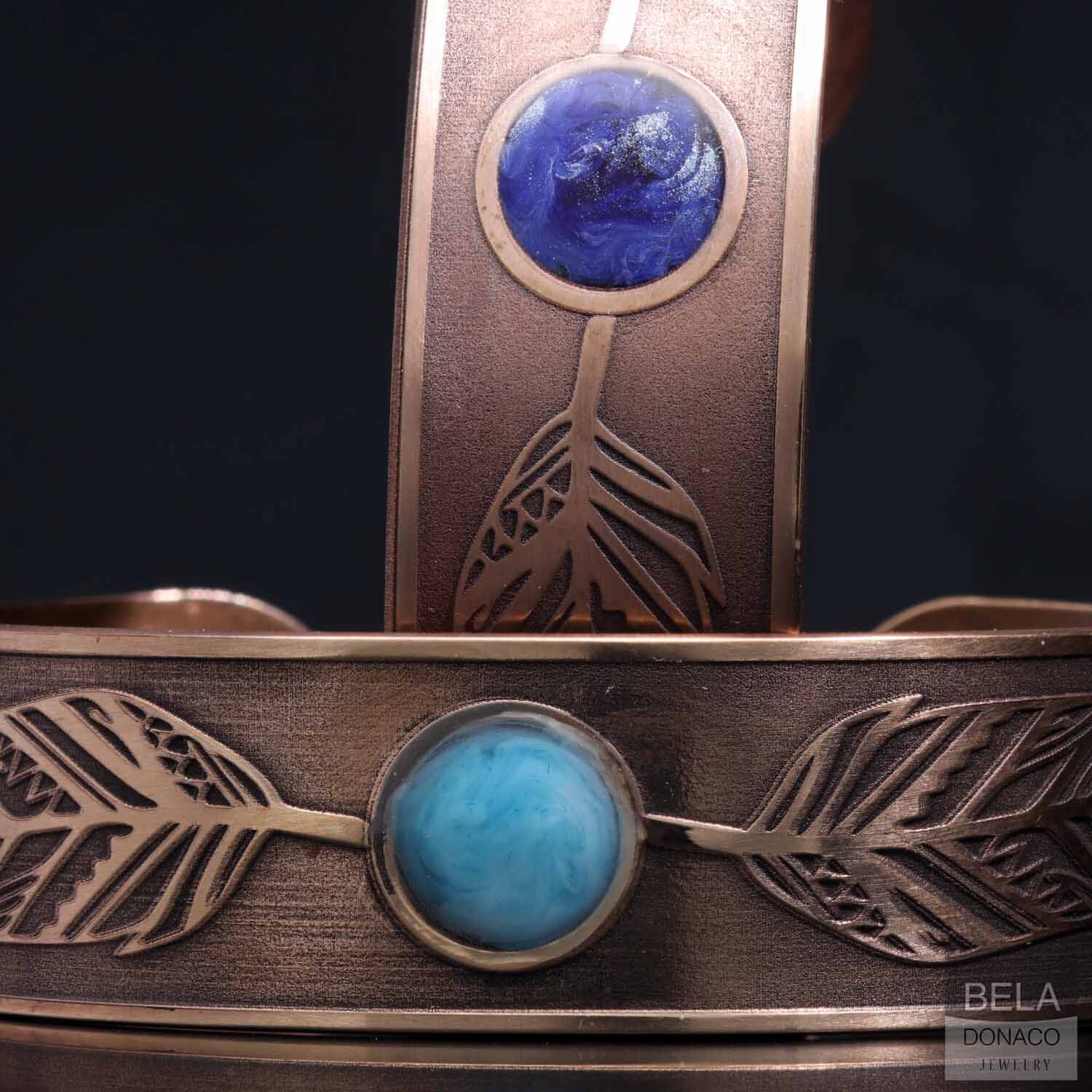 Deze bijzondere armband maakt gebruik van turquoise resin, wat een prachtige aanvulling vormt op het warme, aardse brons. De turquoise resin is met grote precisie ingelegd, wat resulteert in een opvallend patroon dat de essentie van inheemse kunstvormen vangt.