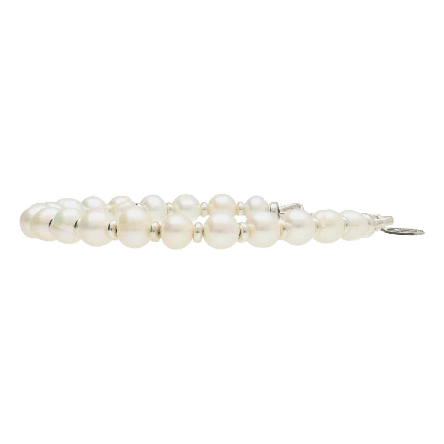 Dit elegante armbandje is vervaardigd uit hoogwaardig sterling zilver en voorzien van schitterende 6 mm witte parels. De combinatie van zilver en parels zorgt voor een tijdloze uitstraling die perfect past bij elke gelegenheid. De parels worden afgewerkt met kleine sterling zilveren kraaltjes, wat een extra vleugje verfijning toevoegt aan het geheel.